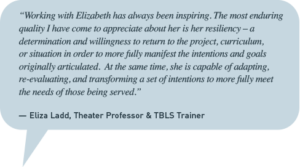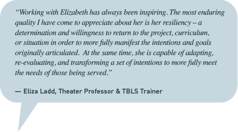 “Working with Elizabeth has always been inspiring. The most enduring quality I have come to appreciate about her is her resiliency – a determination and willingness to return to the project, curriculum, or situation in order to more fully manifest the intentions and goals originally articulated. At the same time, she is capable of adapting, re-evaluating, and transforming a set of intentions to more fully meet the needs of those being served.”
